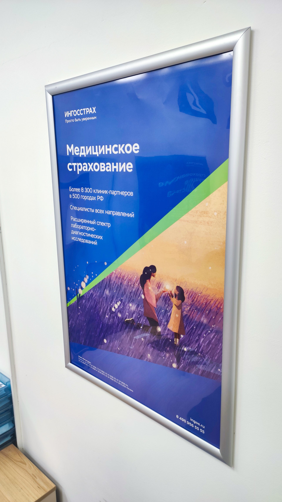 На фото изображён постер «Ингосстрах», посвящённый медицинскому страхованию, закреплённый в алюминиевой рамке на белой стене. В текстовой части указаны направления услуг, количество партнёрских клиник и спектр исследований. Внизу расположена иллюстрация с женщиной и ребёнком, стоящими в поле в лучах мягкого света. Справа заметна часть офисной мебели. На поверхности постера отражаются элементы помещения. Снимок подходит для статей о страховой сфере, корпоративной айдентике и визуальных материалах компаний.