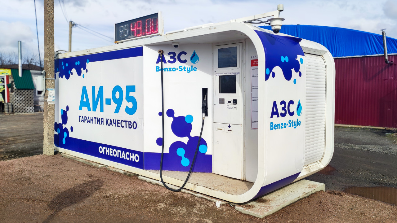 На снимке представлена модульная автозаправочная станция, выполненная в виде компактного бокса с автоматизированной системой выдачи топлива. На боковой панели размещена информация о топливе АИ-95 и электронное табло с ценой. Видны шланг заправки, платежный терминал и элементы системы безопасности. Станция расположена на открытой площадке рядом с объектами малого бизнеса. Такая фотография может быть использована в материалах о современной инфраструктуре, автономных АЗС и развитии технологий обслуживания транспорта.