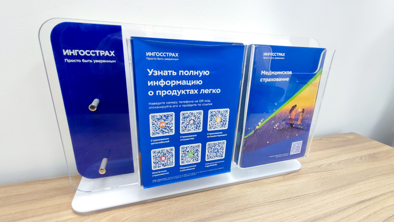 страхование ингосстрах реклама услуги информация pos материалы коммерческая организация маркетинг Ингосстрах буклеты стойка офис медицинское страхование рекламные материалы POS стойка полиграфия клиентская зона интерьер бренд фирменный стиль компания промо информирование офисная среда страховой продукт брошюры деревянная поверхность раздаточные материалы бизнесПохожие фотографии
