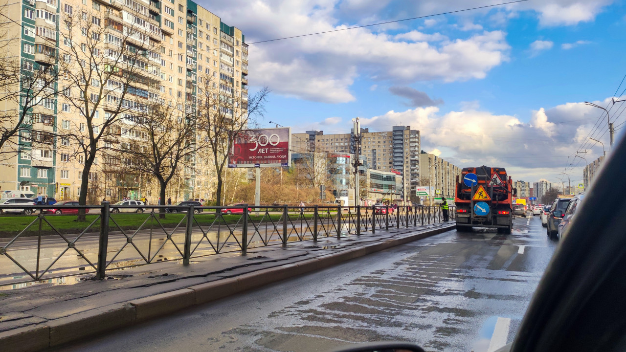На фото изображён участок городской магистрали, где движется спецмашина коммунальных служб с предупреждающими дорожными знаками на заднем борту. Справа видны автомобили, стоящие в потоке, а слева — металлическое ограждение, разделяющее проезжие части. На заднем плане расположены многоэтажные жилые здания, рекламный щит и придорожная зелёная зона. Съёмка выполнена при переменной облачности. Изображение подходит для материалов о дорожных работах, обслуживании городских трасс и транспортной логистике.