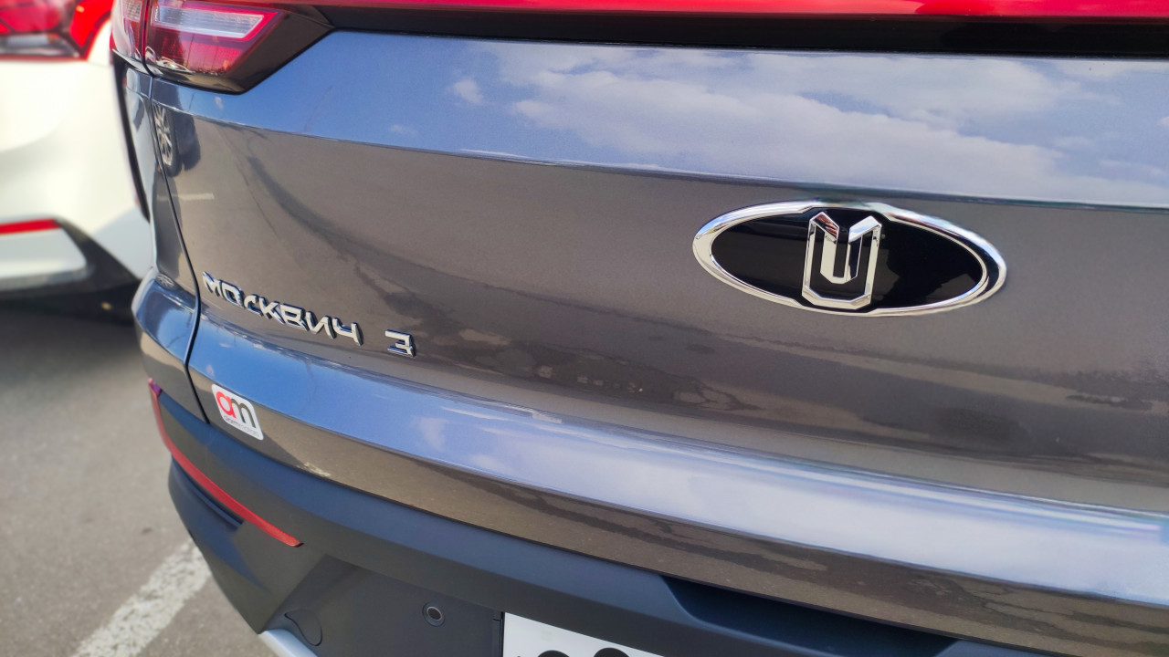 На снимке показана задняя часть автомобиля Москвич 3, снятая под небольшим углом, позволяющим рассмотреть эмблему бренда и название модели. Серый кузов отражает облака и небо, рядом видны другие припаркованные машины. Съёмка проведена в дневное время при естественном освещении. Изображение можно использовать в автомобильных обзорах, новостях о российском автопроме и материалах о городской инфраструктуре.