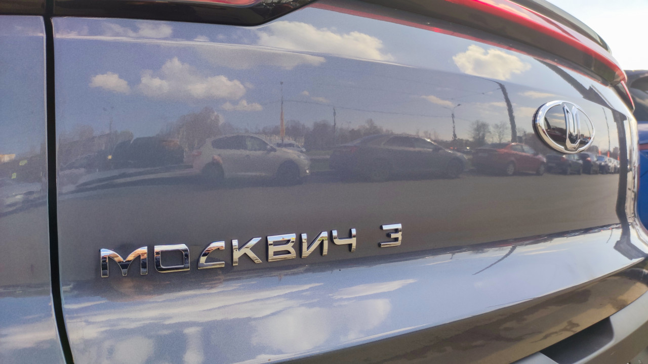 На фото изображена задняя дверь автомобиля с хромированными буквами «Москвич 3» и фирменным логотипом. На лаковой поверхности отражаются припаркованные машины и небо с облаками. Съёмка произведена днём, при мягком естественном освещении. Снимок подходит для иллюстрации автомобильных обзоров, маркетинговых материалов и публикаций о возрождении бренда «Москвич».