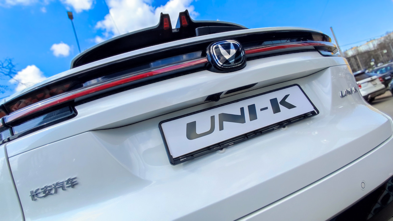 На фотографии крупным планом показана задняя часть автомобиля Changan UNI-K с видимым логотипом марки, надписью модели и спойлером. Съёмка выполнена под низким углом, что подчёркивает линии кузова и детали задних фонарей. На фоне виден участок улицы и другие автомобили. Изображение снято днём при ясной погоде и может быть использовано в автомобильных статьях, промоматериалах и каталогах современных машин.