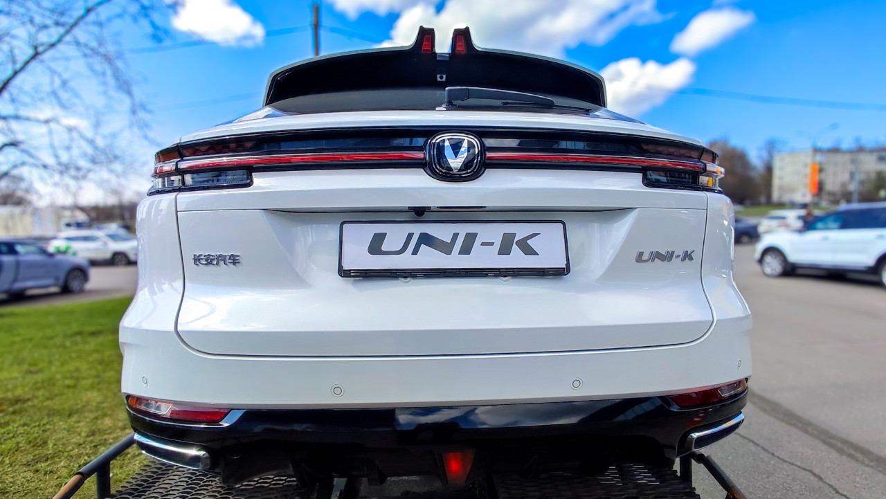 На фото представлен задний вид кроссовера Changan UNI-K белого цвета, стоящего на демонстрационной платформе. Автомобиль отличается горизонтальными фонарями, логотипом бренда и надписью UNI-K. Сцена снята днём, на фоне — городская улица, припаркованные машины и жилые здания. Изображение подходит для автомобильных каталогов, статей о китайских брендах и маркетинговых материалов.