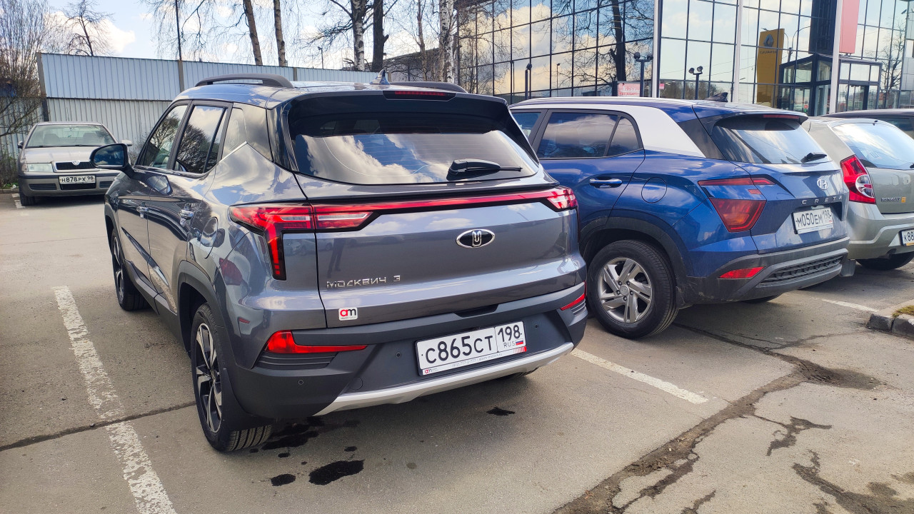 автомобиль легковой автомобиль легковушка машина транспорт авто городской транспорт автотранспорт личный транспорт транспортное средство автомашина Москвич Москвич 3 кроссовер задняя часть парковка Hyundai Creta Россия дилер Alarm Motors бренд эмблема надпись шильдик кузов отражение улица автомобили день город автопром современный автомобиль производство обзор модель дизайнПохожие фотографии