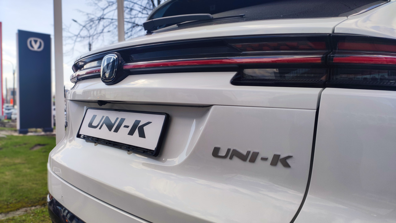 На фотографии изображён белый автомобиль Changan UNI-K, снятый под углом сзади. На багажной двери видны логотип производителя и надпись модели. Слева в кадре стоит фирменный рекламный стенд бренда. Автомобиль расположен на уличной площадке, съёмка проведена при дневном освещении. Снимок можно использовать для статей об автопроме, дизайне кроссоверов и китайских марках на международном рынке.