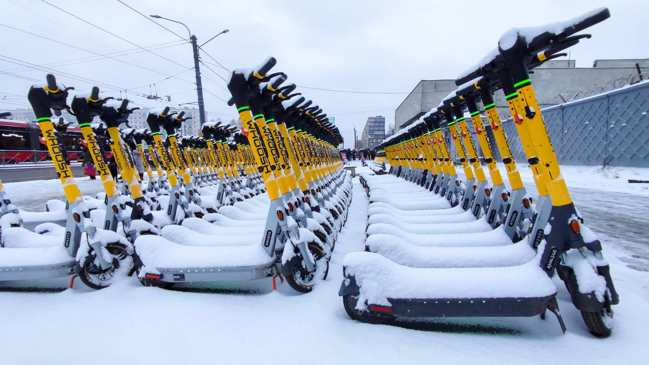 Ряды снежных электросамокатов на фоне городской застройки