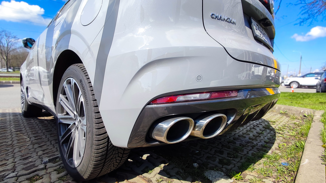 На фото изображён серебристый автомобиль Changan, снятый сзади под углом, где видны четыре выхлопные трубы, задние фонари и шины Hankook. Машина стоит на парковке с зелёной травой и бетонным покрытием. Небо с белыми облаками и городские элементы на фоне создают повседневный контекст. Фото может использоваться в автомобильных обзорах и материалах о современных кроссоверах.