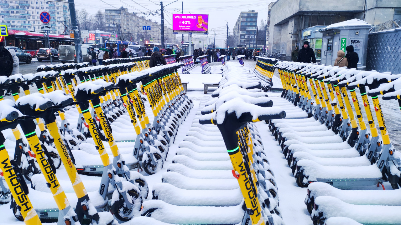 Зимняя парковка электросамокатов возле оживлённой городской улицы