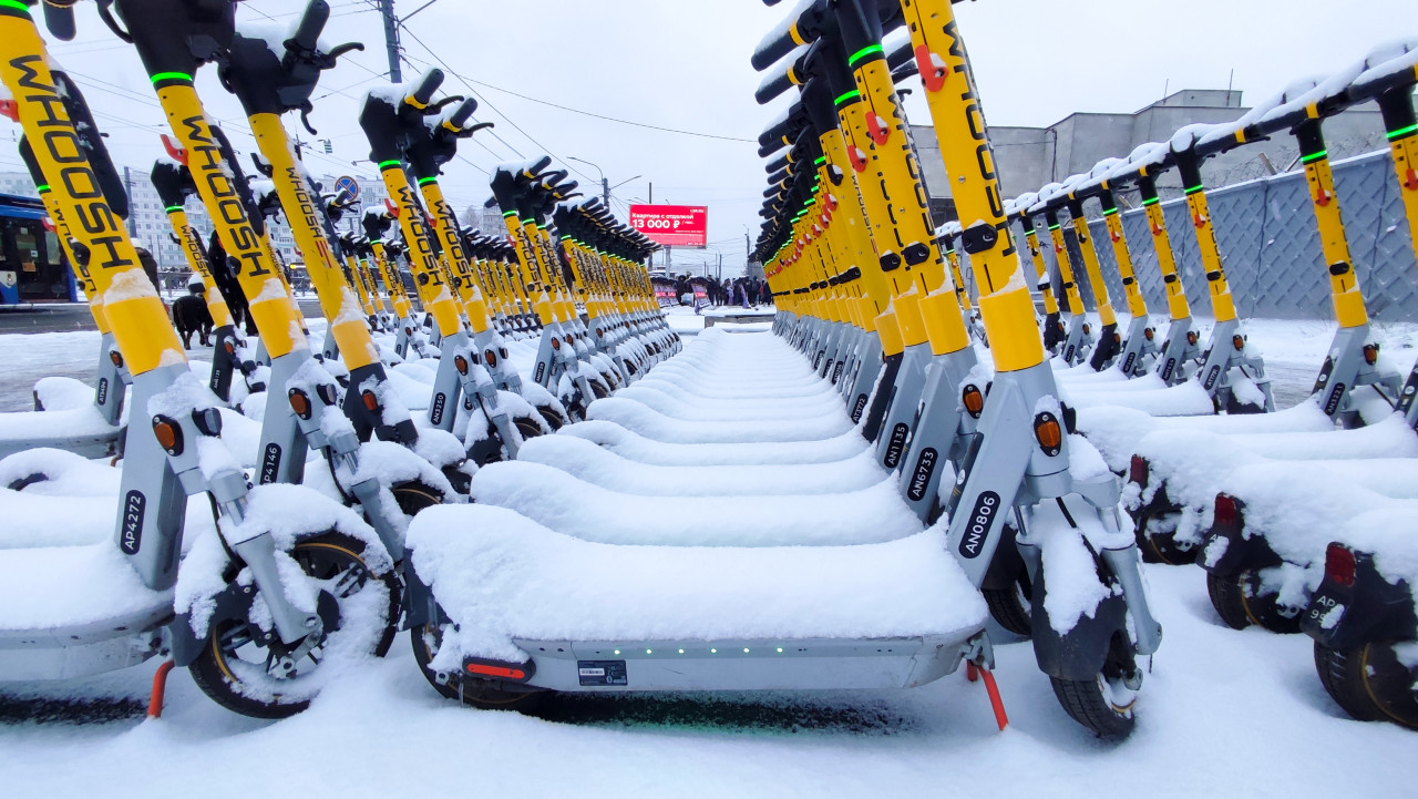 Парковка электросамокатов под снегом рядом с трамвайной линией
