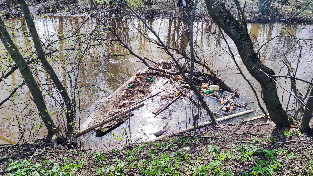 На фотографии изображён берег реки, где среди ветвей деревьев и кустарника скопился мусор — пластиковые бутылки, упаковки и древесные остатки. Вода мутная, отражает кроны деревьев. Весенняя зелень подчёркивает контраст между природой и последствиями загрязнения. Снимок отражает актуальную экологическую проблему и может использоваться в материалах по охране окружающей среды, устойчивому развитию и экопросвещению.