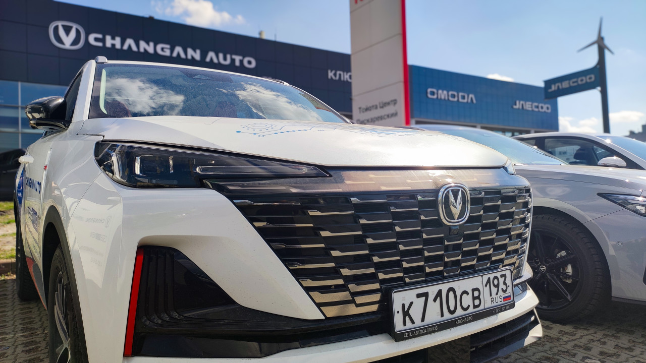 На фотографии изображён крупный план передней части автомобиля Changan CS55 Plus, припаркованного перед зданием автосалона Changan Auto. На заднем плане видны вывески Toyota, Omoda и Jaecoo. На кузове заметны элементы фирменного дизайна и декоративная графика. Снимок сделан при солнечной погоде, с дневным освещением. Фото может использоваться для рекламных публикаций, презентаций моделей и новостей автомобильного рынка.