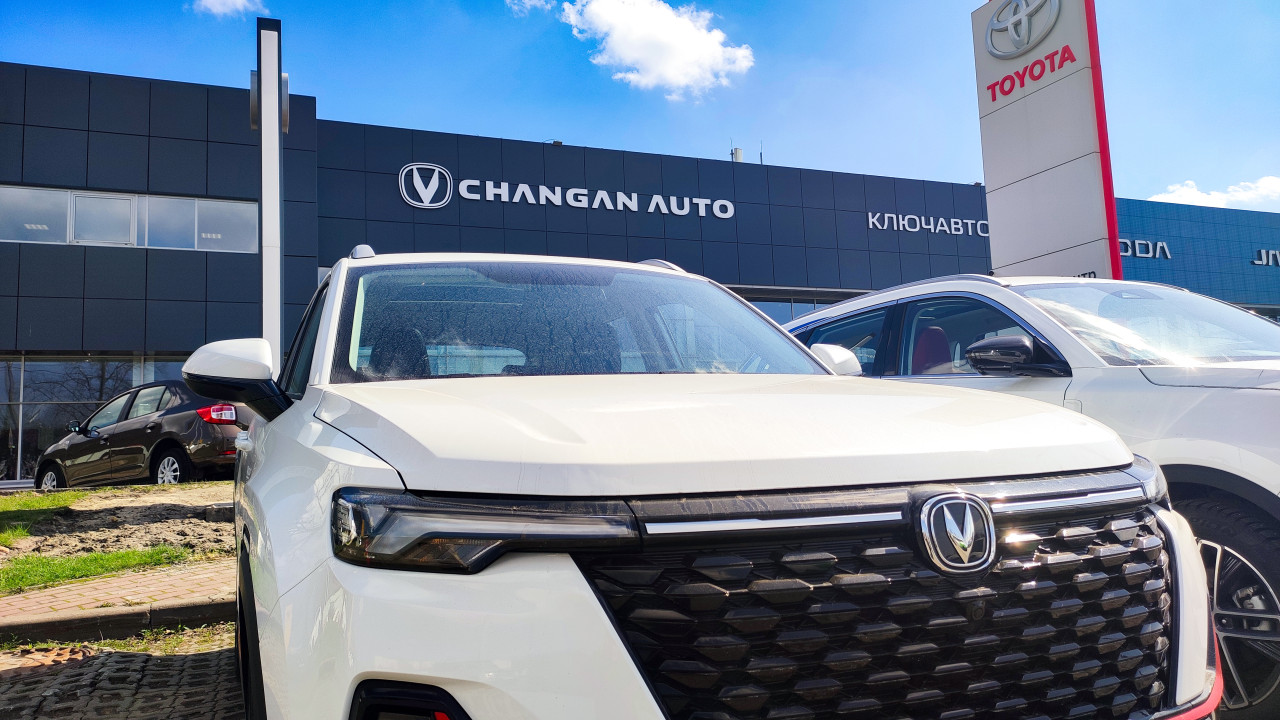 На фотографии показан современный кроссовер Changan CS35 Plus белого цвета, припаркованный перед зданием автосалона Changan Auto. На фоне видны логотипы брендов Toyota и Changan, а также фасад центра с панорамными окнами и темными панелями. Сцена снята при дневном свете, в ясную погоду. Изображение иллюстрирует современный автодилерский комплекс, объединяющий несколько марок автомобилей, и может использоваться для материалов об автомобильной индустрии, дилерских сетях и китайских марках в России.