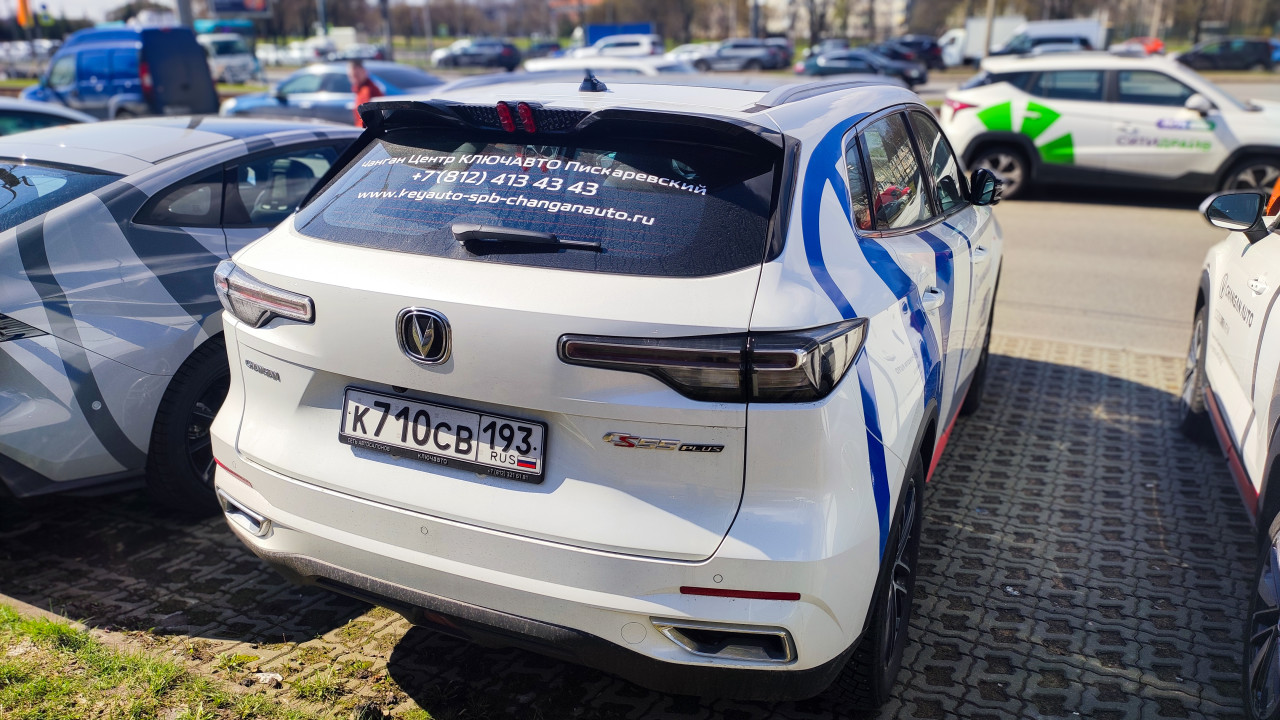 На фото изображена задняя часть белого кроссовера Changan CS55 Plus с синими элементами фирменной графики. На заднем стекле указаны контакты дилерского центра Ключавто Пискаревский в Санкт-Петербурге. Рядом стоят другие автомобили, включая модель Changan CS35 Plus и кроссовер каршерингового сервиса «Ситидрайв». Сцена снята при ярком дневном освещении. Снимок подходит для материалов об автодилерах, автомобильных брендах и городской инфраструктуре.