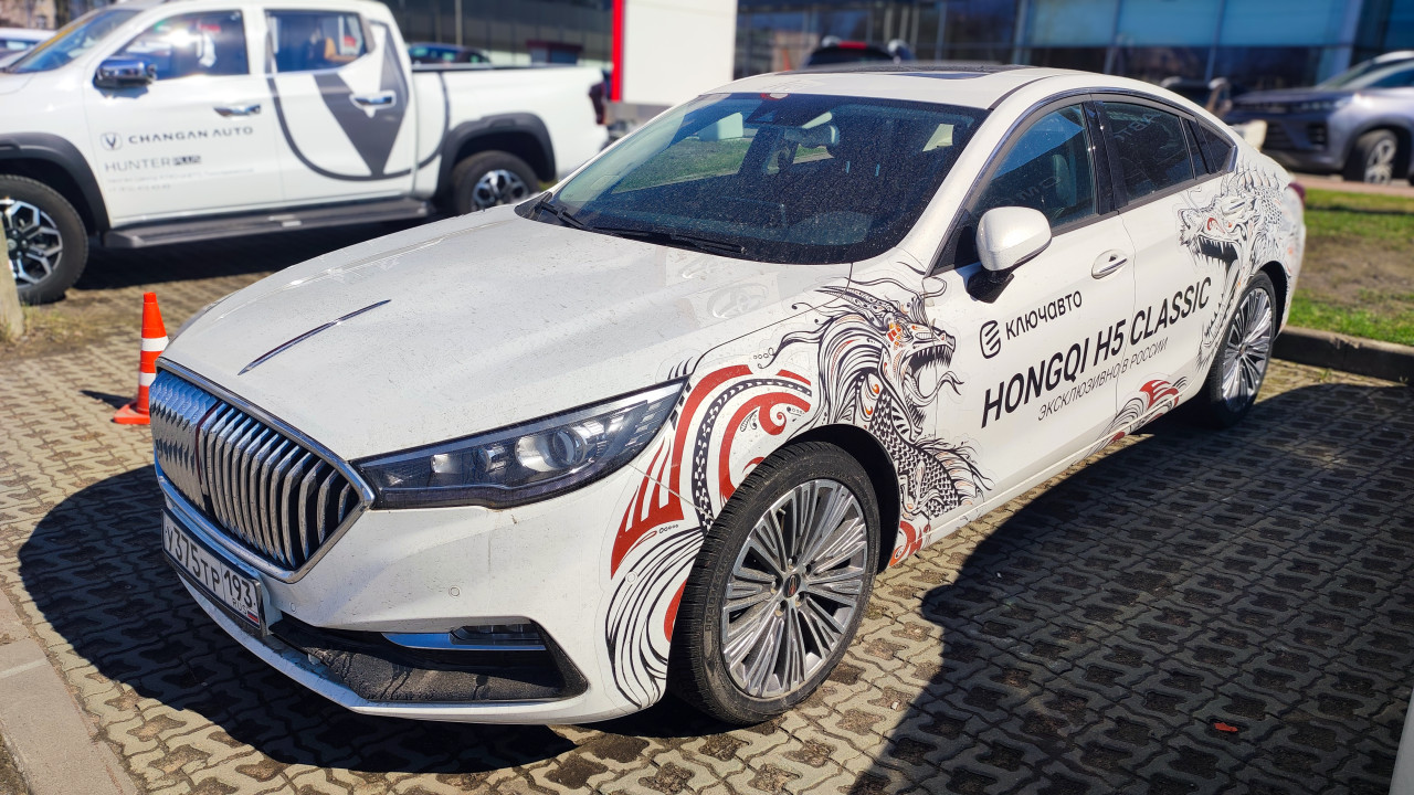 На фотографии изображён седан Hongqi H5 Classic с декоративной графикой в виде восточного дракона, припаркованный на территории автосалона «Ключавто». На заднем плане виден пикап Changan Hunter и здание с витражным фасадом. Сцена снята в солнечный день, предположительно в России, что подтверждается номерным знаком с кодом региона 193. Снимок можно использовать для иллюстрации китайских автомобильных брендов, современной автоиндустрии и дилерских центров.