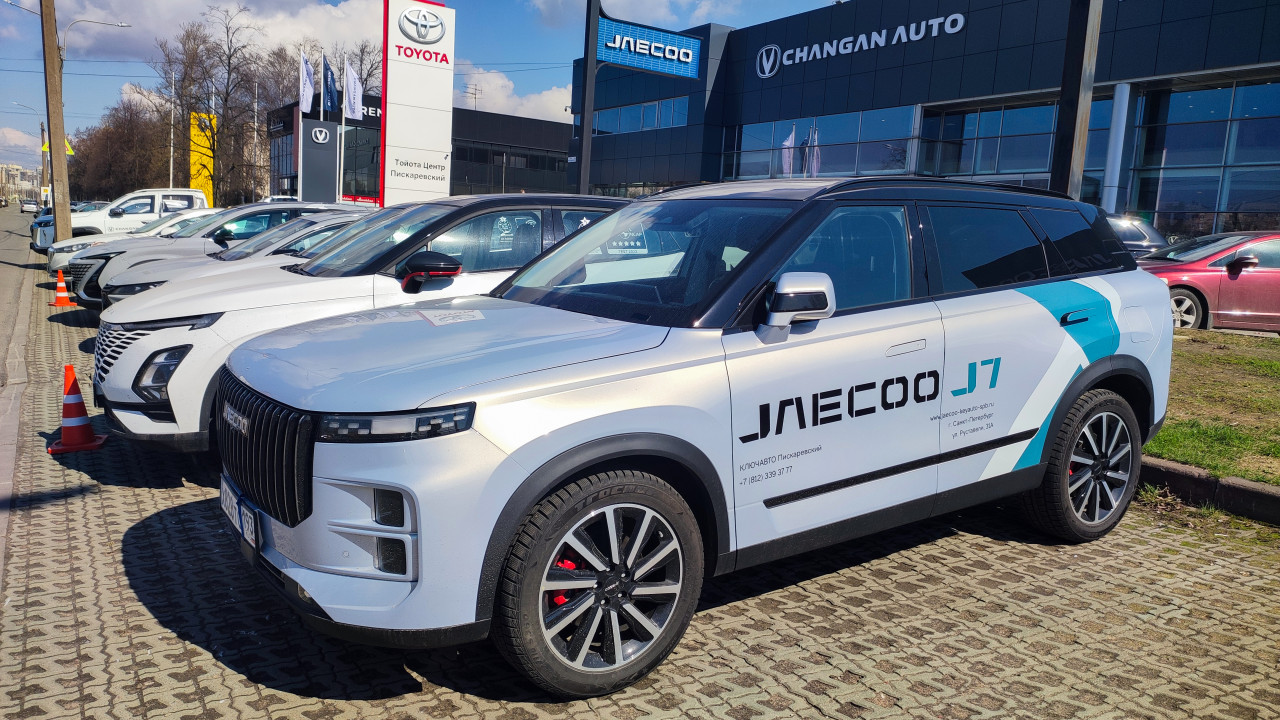 Внедорожник Jaecoo J7 у автосалона с вывесками Toyota и Changan Auto
