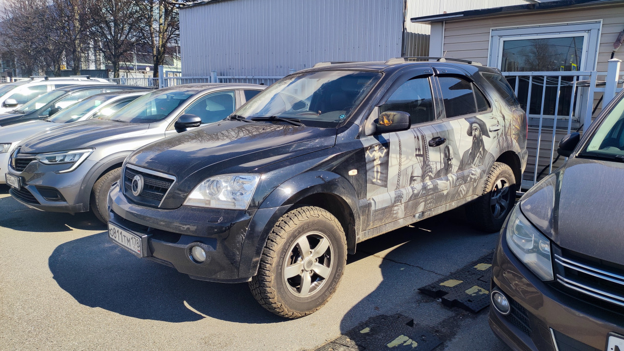 На фотографии изображён чёрный внедорожник SsangYong с оригинальной аэрографией, изображающей сцены с персонажами в исторических костюмах. Автомобиль припаркован на стоянке среди других машин, рядом с металлическим забором и промышленным зданием. Освещение дневное, с мягкими тенями. Фото может быть использовано в материалах о кастомизации автомобилей, автомобильном искусстве и уличной культуре.