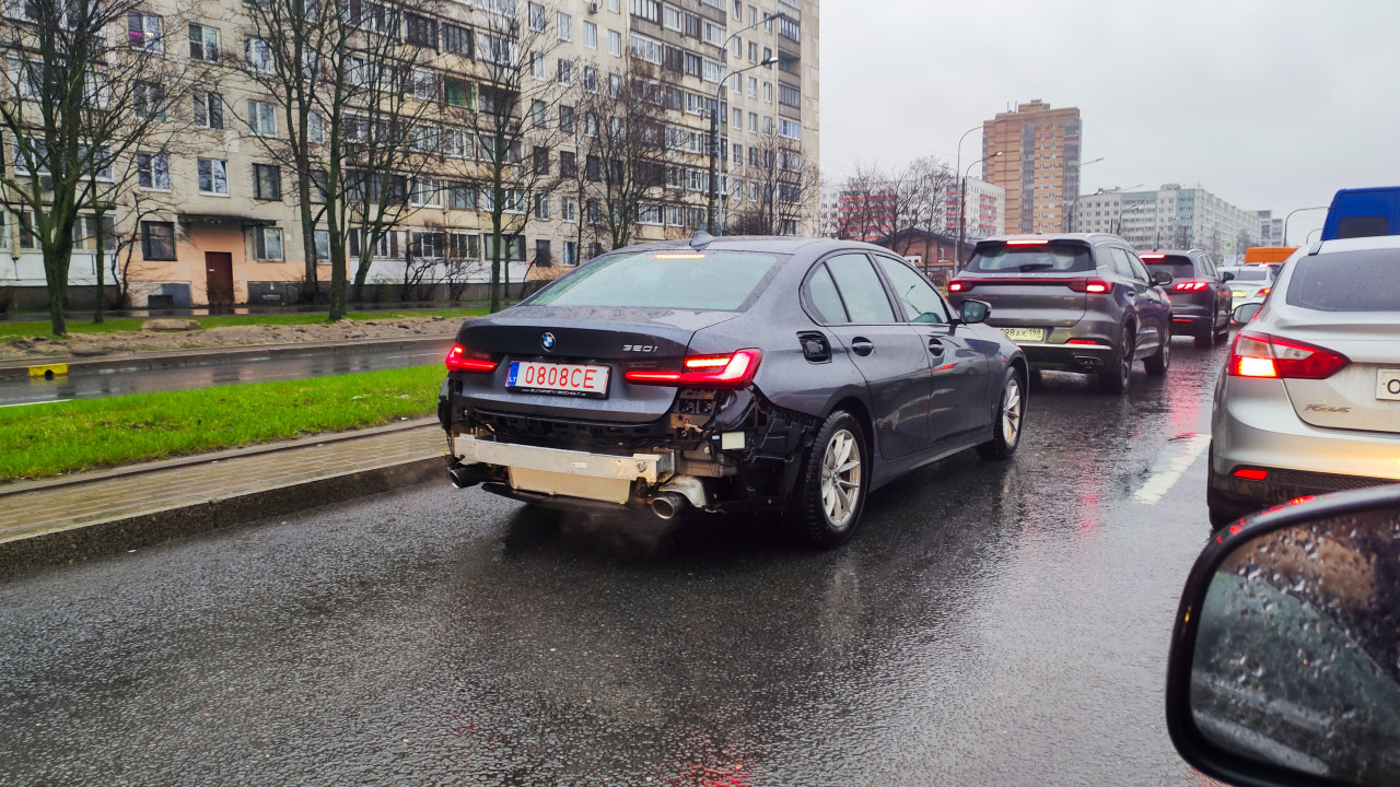 автомобиль легковой автомобиль легковушка машина транспорт авто городской транспорт автотранспорт личный транспорт транспортное средство автомашина BMW 3 Series повреждённый автомобиль отсутствует бампер пробка трафик городская улица дождь мокрая дорога движение городская среда аварийность безопасность движения машины дорожные условия урбанистика многоэтажки улица весна автомобильные повреждения транспортный поток дорожная ситуация эксплуатация непогодаПохожие фотографии