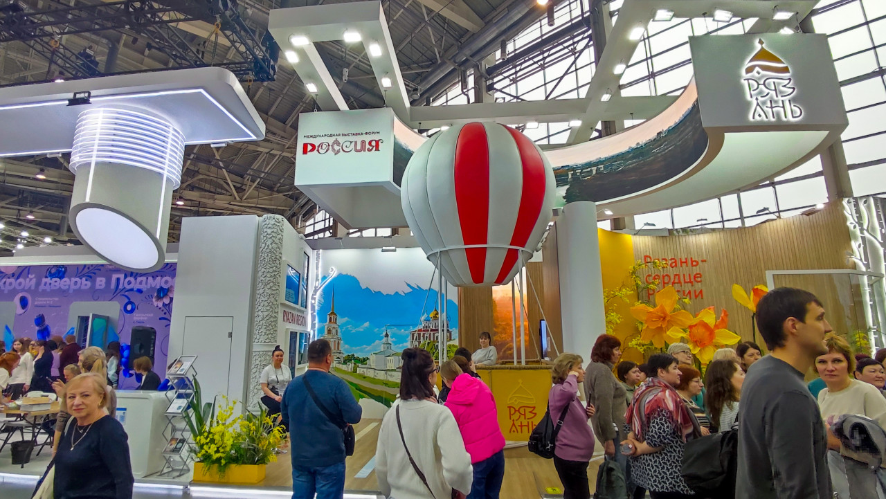 На снимке виден стенд Рязанской области в павильоне №75 ВДНХ, представленный на международной выставке-форуме «Россия» 2023–2024 годов. Центральным элементом экспозиции является большая конструкция в виде воздушного шара, расположенная рядом с панорамой храмовой архитектуры региона. Справа размещена зона «Рязань — сердце России» с крупными декоративными цветами. В кадре присутствует поток посетителей, изучающих экспозиции соседних регионов. Фото можно использовать для обзоров выставок, материалов о региональном брендировании и визуальном оформлении презентационных площадок.