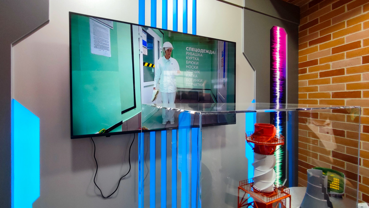 На снимке виден крупный экран, демонстрирующий видеоролик о правилах ношения спецодежды, а рядом размещены макеты промышленного оборудования — в частности, высокая оранжевая установка с винтовым каналом и разрезные модели конструкций. Фон включает кирпичную стену и декоративные световые элементы. Сцена снята в пределах выставочного пространства и подчёркивает сочетание обучающих материалов и инженерных экспонатов. Фотография может использоваться для публикаций о промышленной безопасности, технике и выставочных демонстрациях.