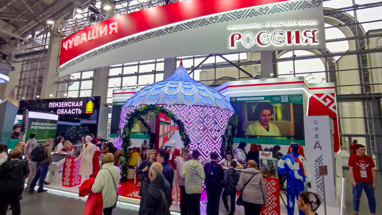 На фотографии показан стенд Чувашской Республики, оформленный в национальной стилистике и представленный в павильоне №75 ВДНХ в рамках международной выставки-форума «Россия» (2023–2024). В центре композиции расположен павильон с орнаментами и декоративным куполом, подсвеченным яркими цветами. Вокруг размещены экспонаты, манекены с национальной одеждой и интерактивные зоны. На заднем плане видны стенды других регионов, включая Пензенскую область. Снимок подходит для публикаций о культурных мероприятиях, региональных презентациях и этнографических экспозициях.
