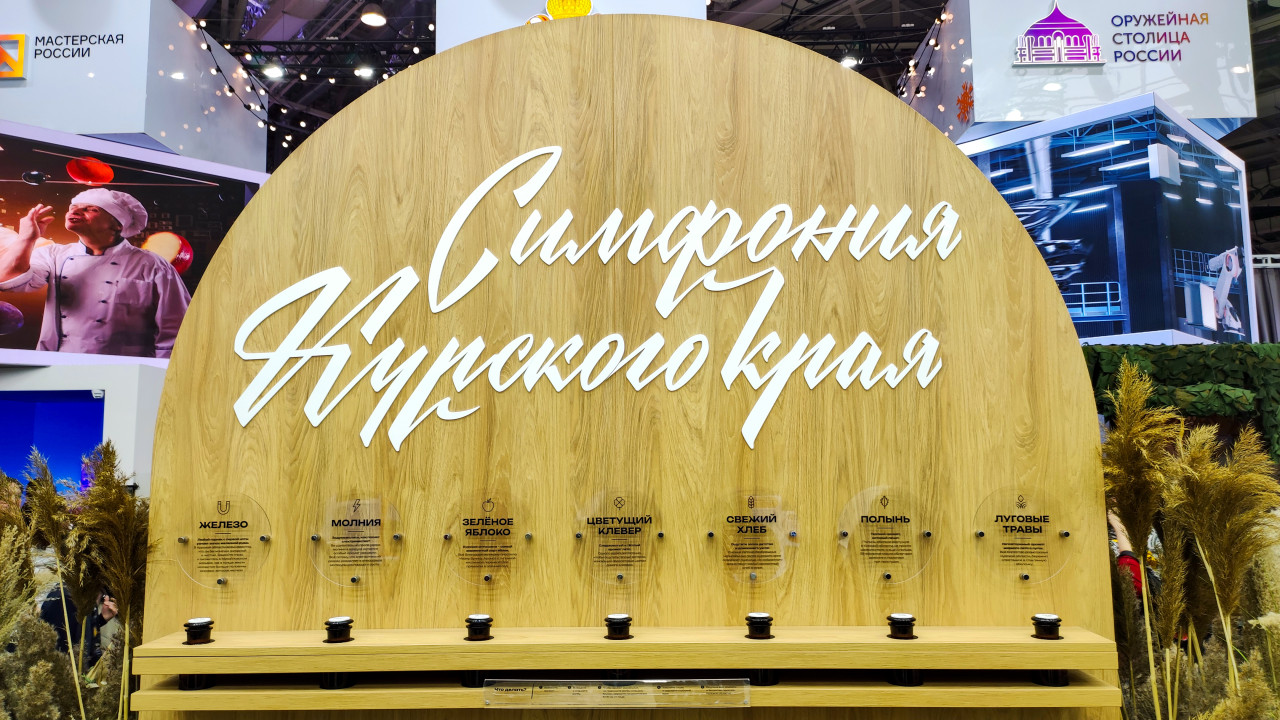 Снимок демонстрирует декоративную инсталляцию «Симфония Курского края», размещённую на стенде региона в павильоне №75 выставки-форума «Россия» на ВДНХ. На деревянной панели крупным шрифтом выполнено название композиции, ниже — несколько прозрачных табличек с описанием тематических образов: железо, молния, зелёное яблоко, клевер, хлеб, полынь и луговые травы. Перед панелью располагаются кнопочные модули для интерактивной активности. По бокам видны элементы растительного оформления. Фотография подходит для публикаций о региональных презентациях и выставочном дизайне.