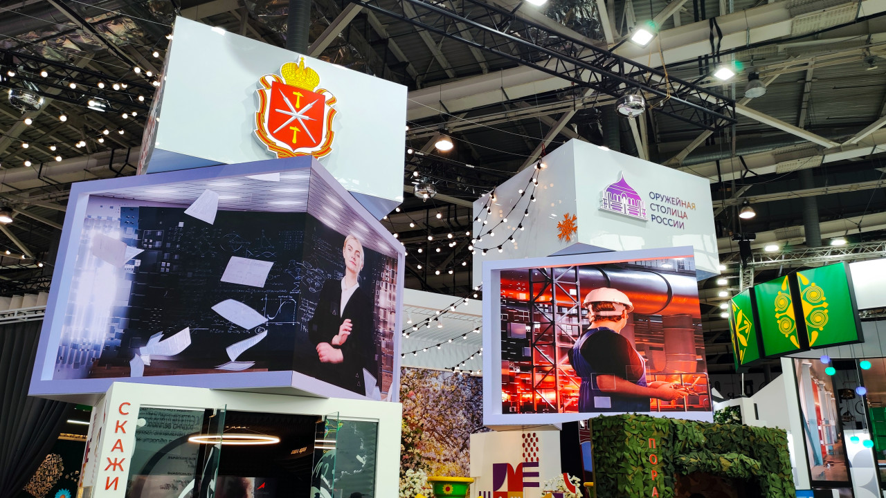 На фотографии представлены световые мультимедийные кубы, размещённые на одном из региональных стендов выставки-форума «Россия» в павильоне №75 на ВДНХ. На экранах транслируются изображения специалистов, промышленного производства и графических элементов. В верхней части виден герб региона и логотип «Оружейная столица России». В пространстве экспозиции установлены подвесные световые гирлянды, подчёркивающие оформление зоны. Снимок подходит для материалов о выставочном дизайне, цифровом контенте и региональном продвижении.