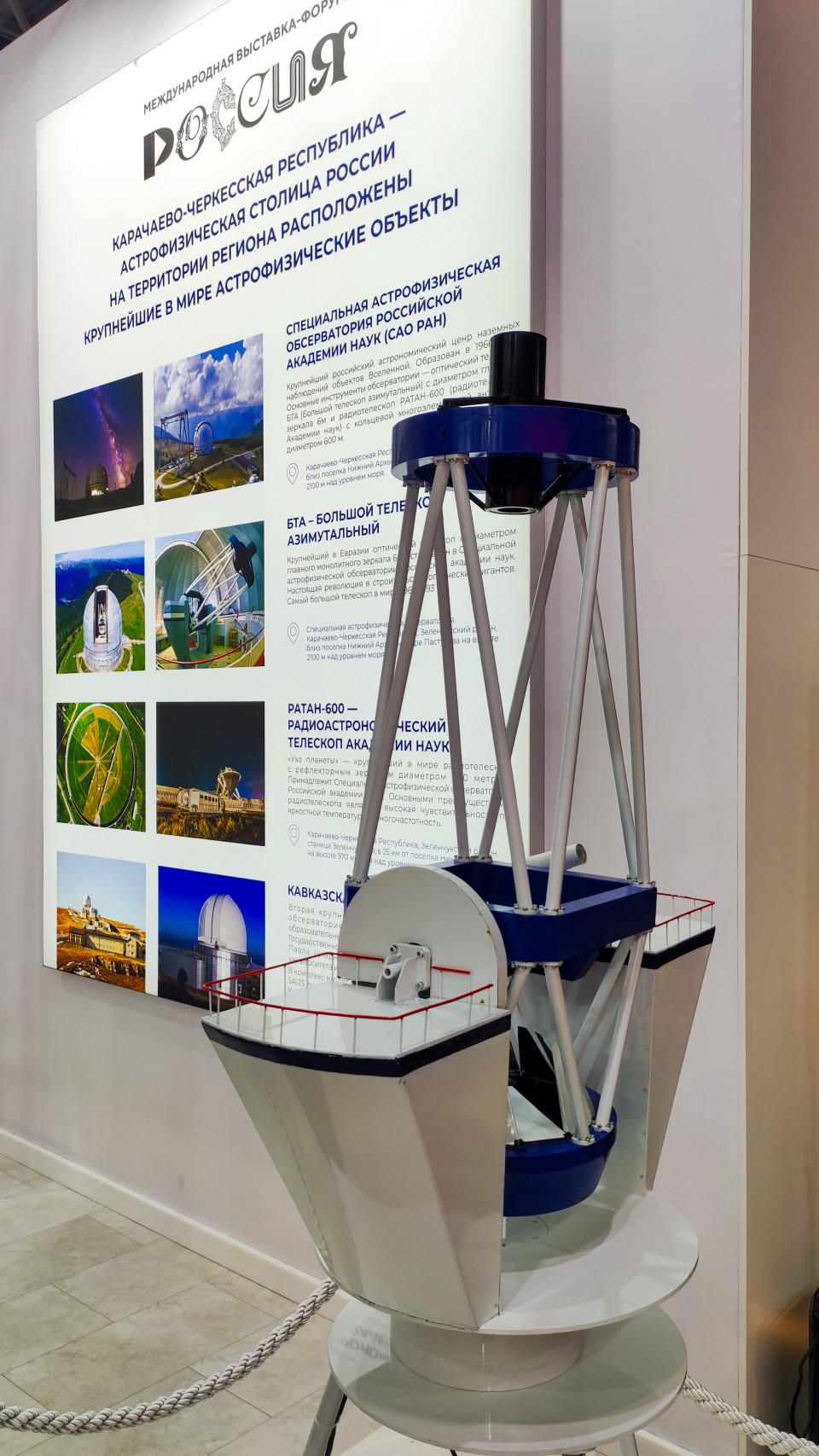 На изображении показан подробный макет телескопа, установленный у информационного стенда Карачаево-Черкесской Республики на выставке-форуме «Россия» в павильоне №75 ВДНХ. На стеновой панели размещены фотографии и описания астрофизических объектов региона, включая РАТАН-600 и БТА — ключевые инструменты Специальной астрофизической обсерватории РАН. Видны конструкционные элементы модели, ограждение, а также часть пола и стен экспозиционной зоны. Снимок подходит для материалов об астрономии, научных комплексах и популяризации высокотехнологичных исследований.