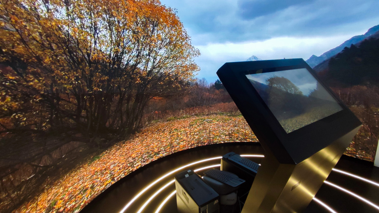 На изображении представлена мультимедийная зона стенда Карачаево-Черкесской Республики в павильоне №75 выставки-форума «Россия» на ВДНХ. Панорамный экран демонстрирует осенний горный ландшафт с деревьями в золотой листве, поляной, опавшими листьями и фрагментами горных склонов. На переднем плане расположен интерактивный терминал, синхронизированный с основным экраном. Видны световые круги пола и компьютерное оборудование, управляющее экспозицией. Снимок подходит для материалов о природных сезонах, визуализациях региональных ландшафтов и современных выставочных технологиях.