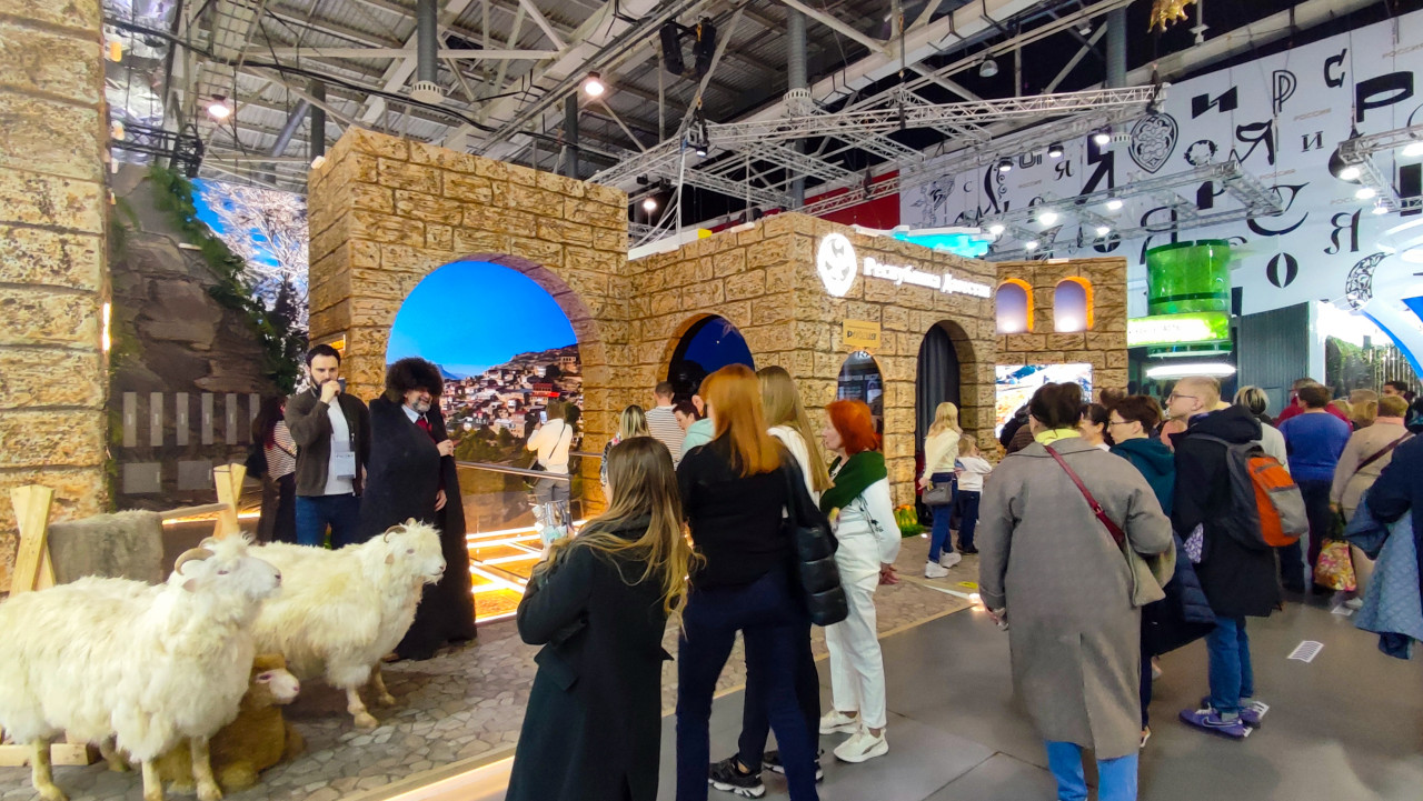 На фотографии представлена экспозиция Республики Дагестан в павильоне №75 на выставке-форуме «Россия» на ВДНХ. В центре кадра — стилизованные каменные арки, напоминающие традиционную горную архитектуру региона, а также декоративные фигуры баранов, относящиеся к пастушьей культуре Дагестана. Видны ведущие мероприятия, посетители и элементы светового оформления. На фоне демонстрируется пейзаж горного аула, подчёркивающий исторический быт региона. Фото подходит для публикаций о культурном разнообразии России, этнографии и выставочной деятельности.