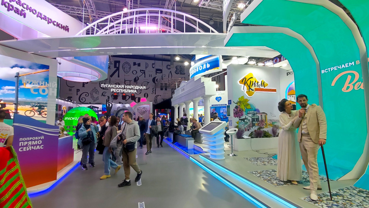Фотография показывает посетителей, перемещающихся между стендами Краснодарского края, Луганской народной республики, Севастополя и Республики Крым в павильоне №75 ВДНХ во время выставки-форума «Россия» (2023–2024). В кадре видны яркие архитектурные конструкции, интерактивные зоны и подиум с актёрами в исторических костюмах. Снимок отражает насыщенную атмосферу мероприятия и разнообразие региональных экспозиций. Может использоваться в материалах о выставках, туризме, региональных презентациях и общественных событиях.