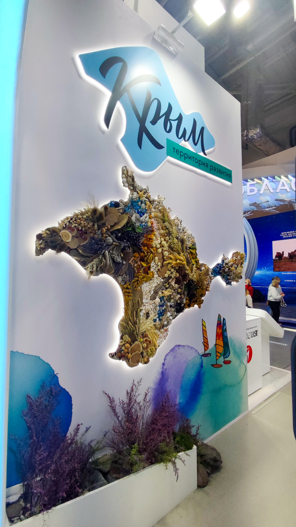 Снимок сделан на международной выставке-форуме «Россия» в павильоне №75 ВДНХ. Представлен стенд Республики Крым, украшенный большим декоративным рельефом полуострова, выполненным из природных материалов: древесины, сухоцветов, камней, ягод и ракушек. Подсветка по контуру подчёркивает форму экспозиции. В нижней части размещена декоративная растительность. На заднем плане частично видны элементы соседних стендов. Фотографию можно использовать в темах о региональной идентичности, туристических презентациях и выставочном дизайне.