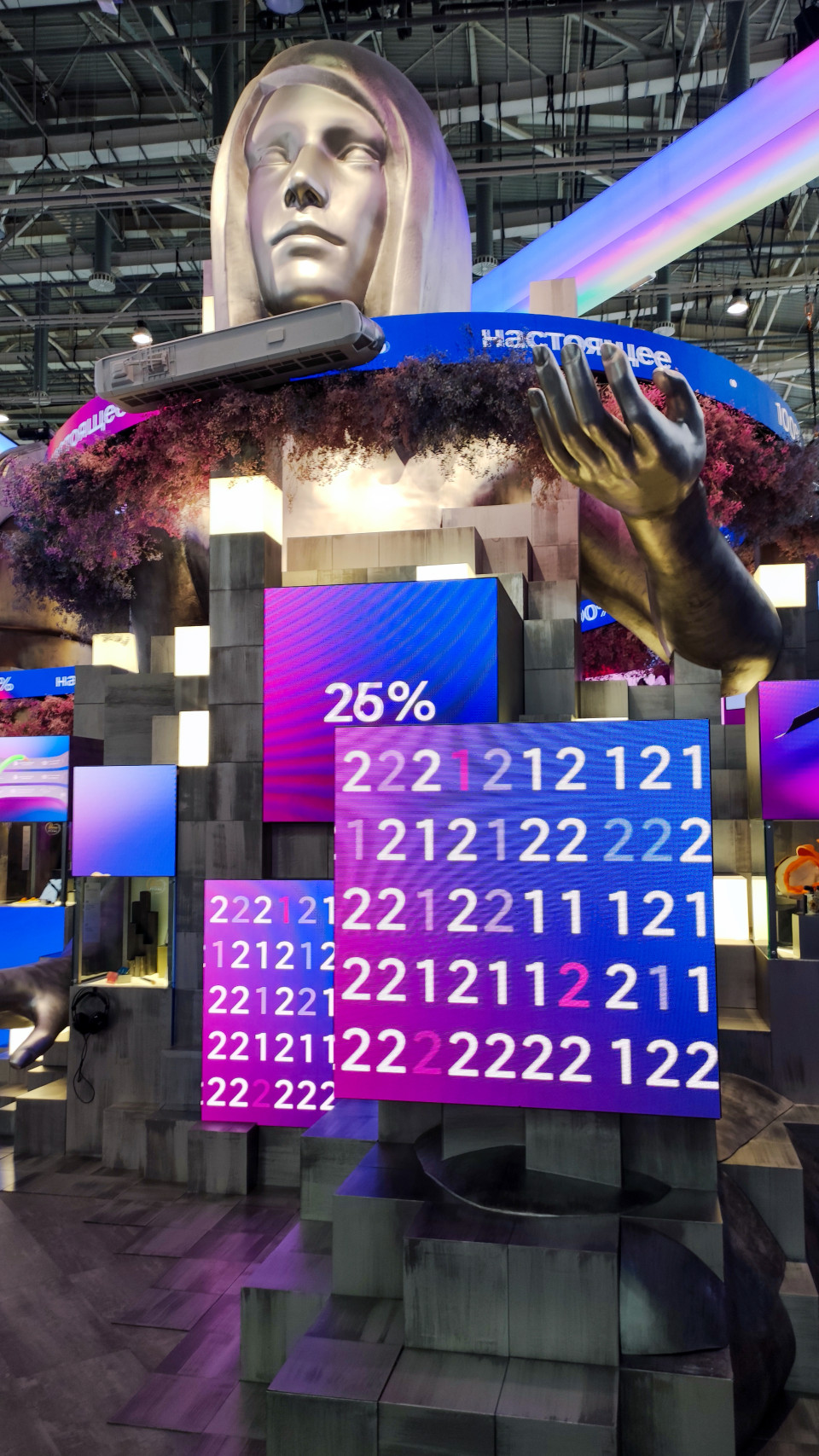 Мультимедийная зона с большими экранами и скульптурой головы на выставке ВДНХ