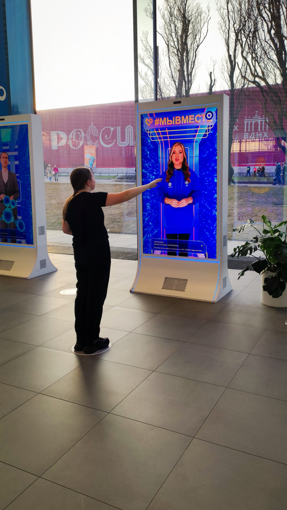 На снимке изображена девушка, использующая жестовое управление интерактивной панелью в павильоне «АТОМ», который представляет достижения и перспективы отечественной атомной энергетики. Через панорамные стеклянные стены видно пространство ВДНХ и временные конструкции выставки «Россия». Панель показывает видеопрезентацию одного из участников проекта, оформленную в фирменной стилистике экспозиции. Павильон включает семь этажей с тематическими зонами, в том числе «Атомариум» с лабораторными установками. Фото подходит для материалов о технологиях взаимодействия, цифровых музейных решениях и современных образовательных пространствах.