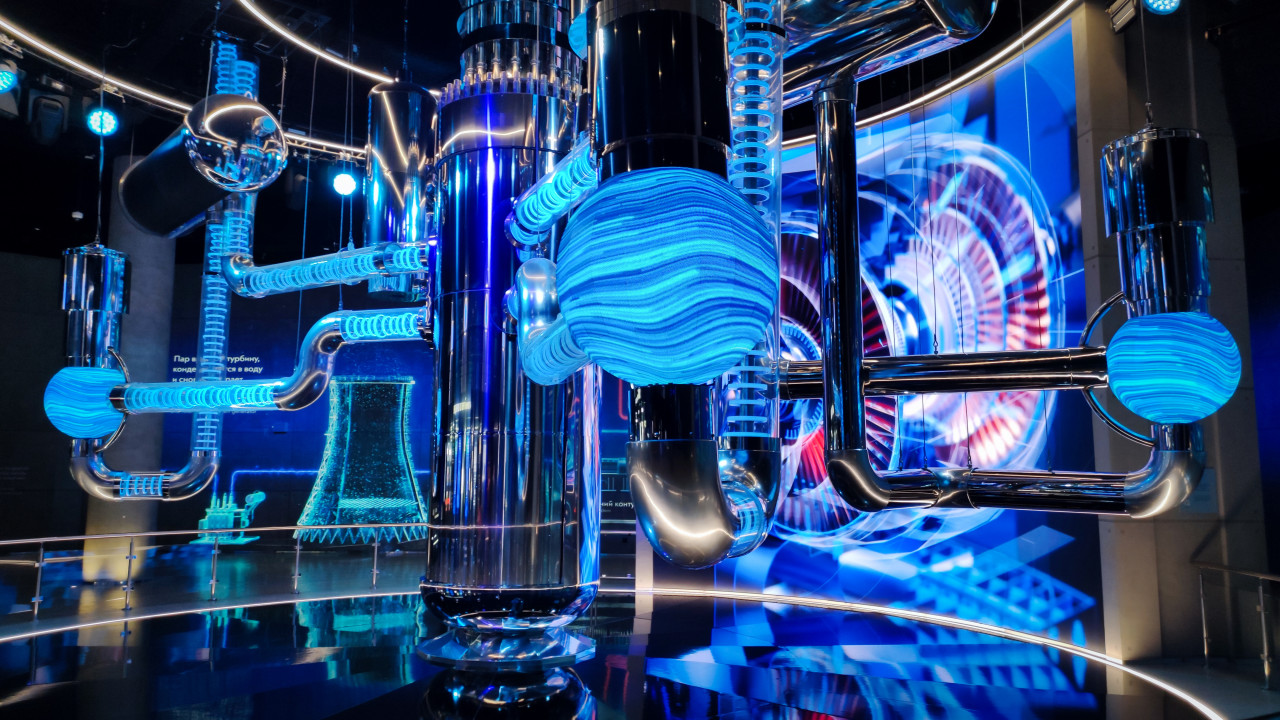 На изображении показана объёмная световая конструкция с хромированными трубами, светящимися трубчатыми элементами и крупной голубой сферой, размещённая в павильоне «АТОМ» на ВДНХ в рамках выставки-форума «Россия» 2023–2024 годов. Фон дополнен анимированными экранами, визуализирующими элементы турбин и технологических процессов атомной энергетики. Инсталляция служит частью демонстрационного пространства, знакомящего посетителей с принципами работы энергетических систем. Фото применимо в материалах о науке, технологиях и музейных экспозициях.