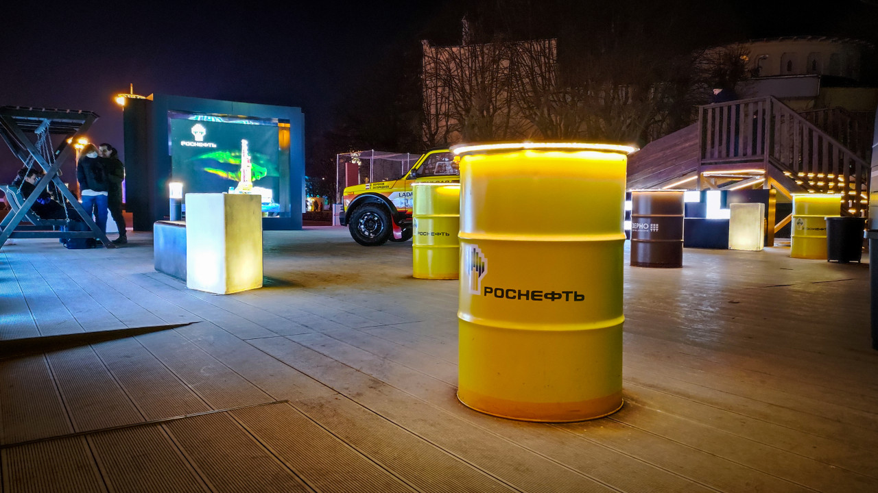 На фотографии изображена ночная зона уличной экспозиции ВДНХ, оформленная в стиле индустриального пространства. На переднем плане стоят жёлтые металлические бочки с логотипом «Роснефть», дополненные внутренней подсветкой. В глубине кадра виден ярко оформленный автомобиль LADA в корпоративных цветах компании. Рядом расположены подсвеченные сидения и конструкция с цифровым экраном. Сцена снята во время работы выставки-форума «Россия» 2023–2024 годов и может быть использована в материалах о брендинге, нефтяной отрасли и публичных мероприятиях.