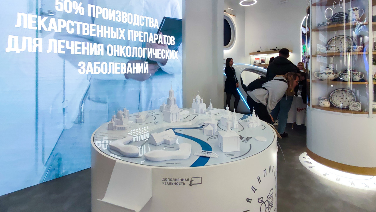 Фотография сделана в павильоне №75 ВДНХ во время Международной выставки-форума «Россия» (2023–2024), где представлены экспозиции 89 регионов. В кадре показан интерактивный макет исторического города Суздаля — одного из центров Золотого кольца России, включающего храмы XII–XVIII веков, выполненные в виде миниатюрных моделей. Слева — крупный LED-экран с информационными материалами о региональном производстве лекарственных препаратов. Справа видна витрина с традиционной керамикой. Фото подходит для публикаций о региональном развитии, туризме и выставочных проектах.