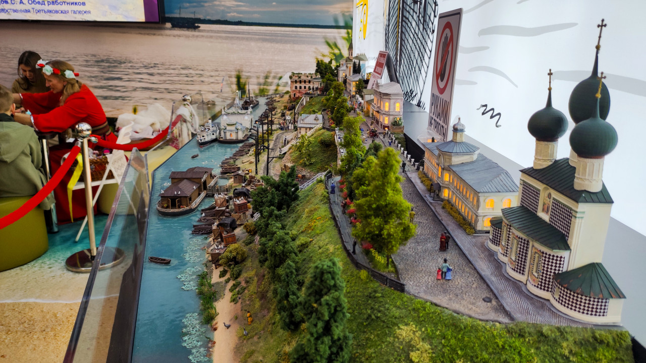 Фотография демонстрирует детализированный миниатюрный макет набережной с деревянными пристанями, лодками, речными судами и архитектурой, выполненной по мотивам городских построек XIX века. Справа представлены здания с куполами, а слева видны посетители экспозиции. Снимок выполнен в павильоне №75 «Регионы России» на ВДНХ в Москве в период международной выставки-форума «Россия» (2023–2024). Изображение подходит для материалов о музейных проектах, образовательных программах и исторических реконструкциях.