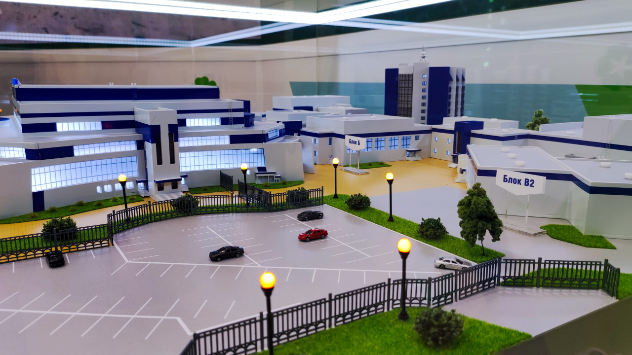 Макет жилых кварталов и дорожной сети с зелёными зонами