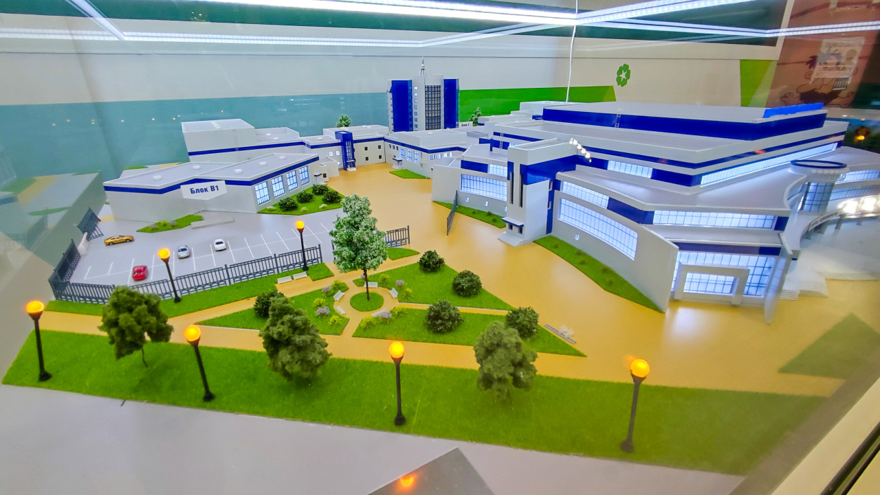 Макет Дворца единоборств в Брянске с зелёной зоной и дорожками