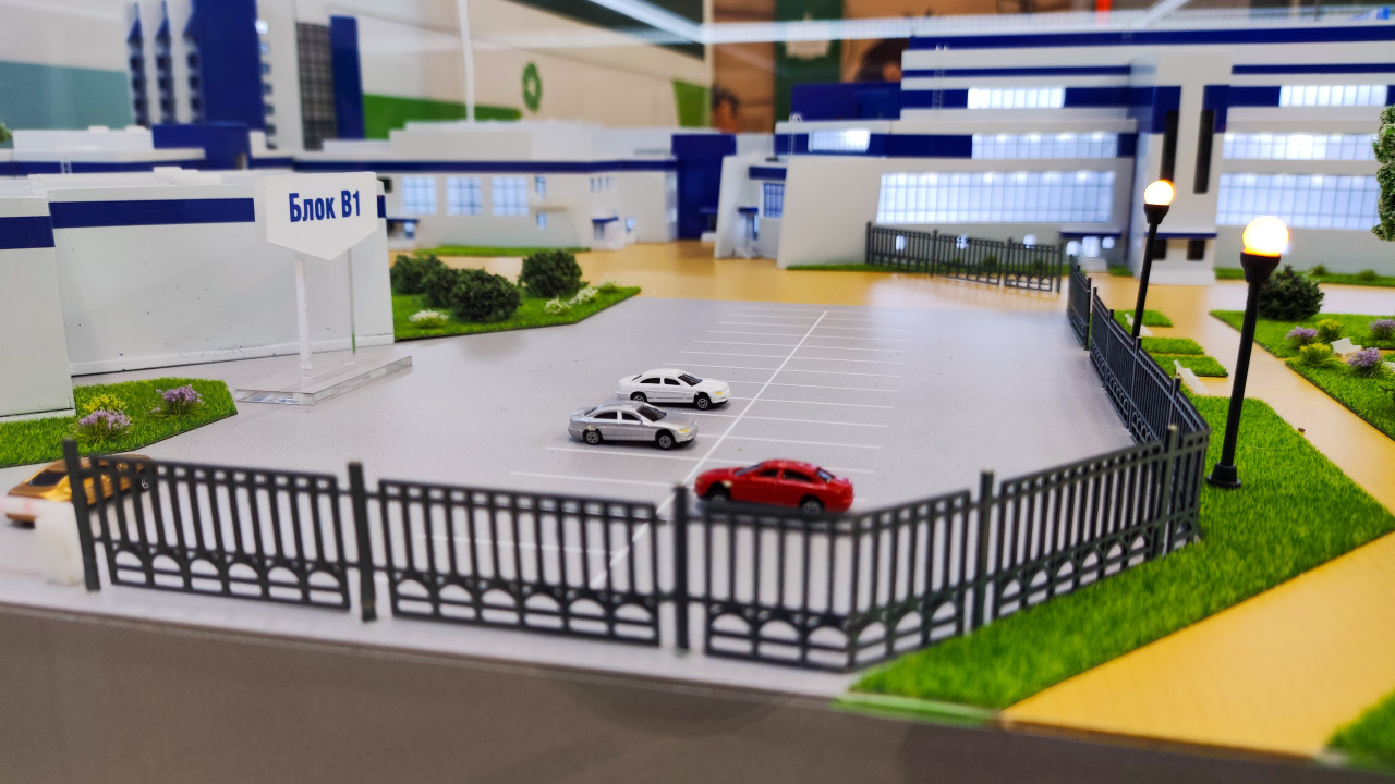 Фрагмент макета жилого комплекса с парковками и зелеными зонами