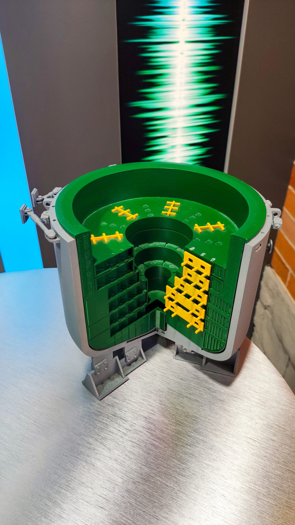 На фото представлена разрезная модель крупного резервуара цилиндрической формы, демонстрирующая внутренние уровни и инженерные элементы конструкции. Верхняя часть выполнена в зелёном цвете, а поддерживающие детали внутри выделены жёлтым, что подчёркивает функциональные зоны. Макет размещён на металлической поверхности в пределах выставочного пространства. Снимок подходит для материалов об устройстве промышленных резервуаров, образовательных проектов и презентаций инженерных систем.
