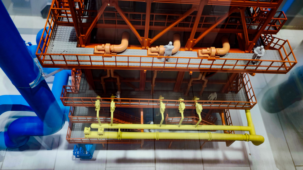 На изображении представлен подробный фрагмент макета технологической установки, включающий несколько уровней площадок, оранжевые опорные балки, трубопроводы и технические коридоры. Рассматриваемый участок показывает внутреннее расположение коммуникаций и инженерных узлов. На площадках размещены миниатюрные фигурки сотрудников, подчёркивающие эксплуатационное назначение объекта. Фото подходит для материалов о промышленном моделировании, устройстве производственных систем и образовательных визуализациях.