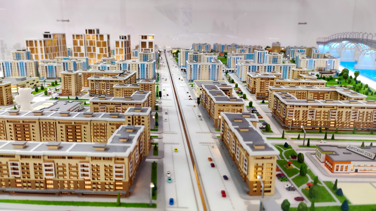 На фотографии представлен детальный архитектурный макет современной городской планировки, демонстрируемый на выставке-форуме «Россия» в павильоне №75 ВДНХ (2023–2024). В центре кадра — широкая магистраль с разделительной полосой и миниатюрными транспортными моделями. По обе стороны расположены кварталы многоэтажных жилых домов различной высоты, оформленные в бежевых и голубых оттенках. В глубине видны высотные здания и декоративный мост с подсветкой. Макет используется для демонстрации принципов градостроительного развития и подходит для публикаций о современном проектировании и урбанистике.