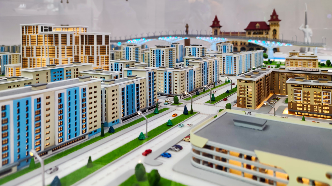 Макет жилых кварталов с высотной застройкой и мостом на заднем плане
