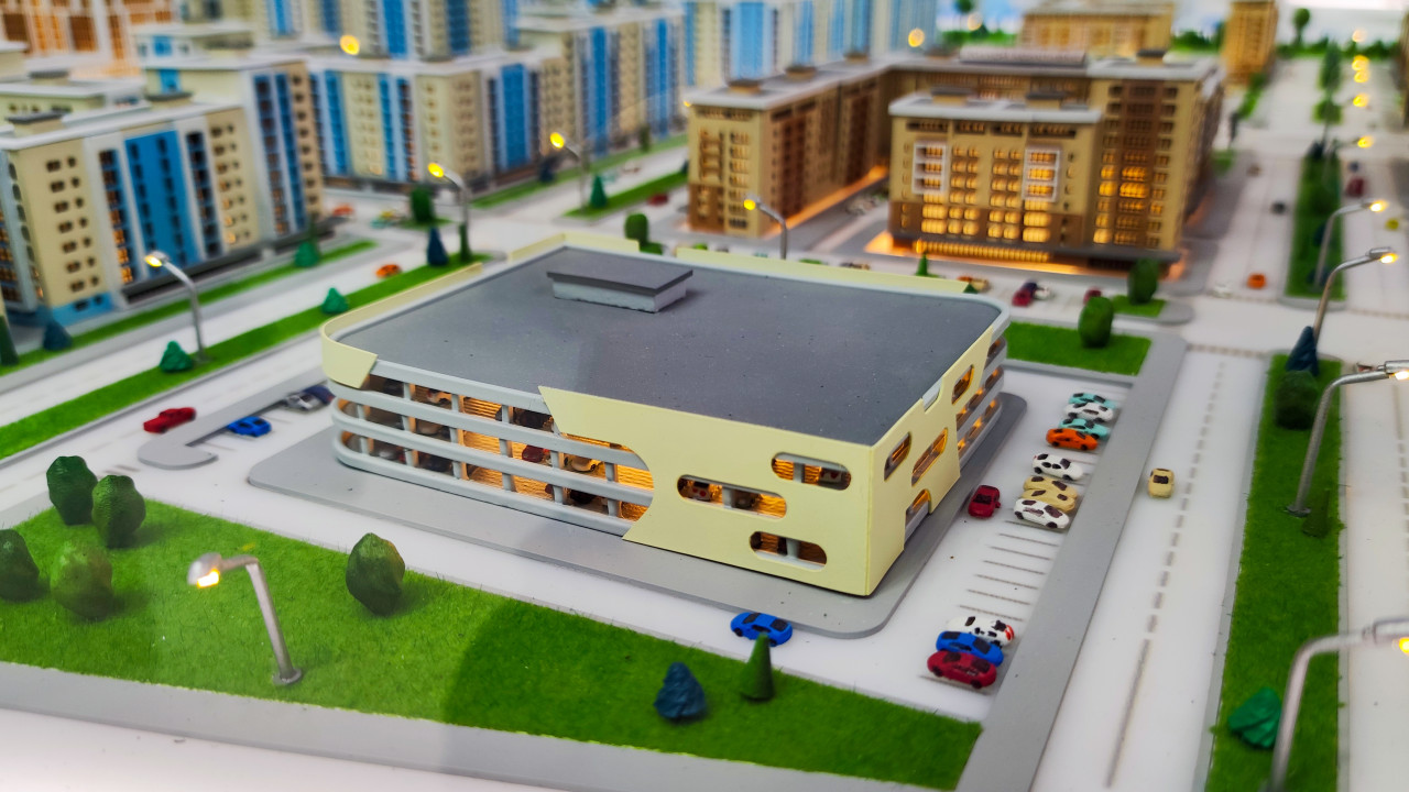 Макет многоуровневого паркинга и прилегающей жилой застройки
