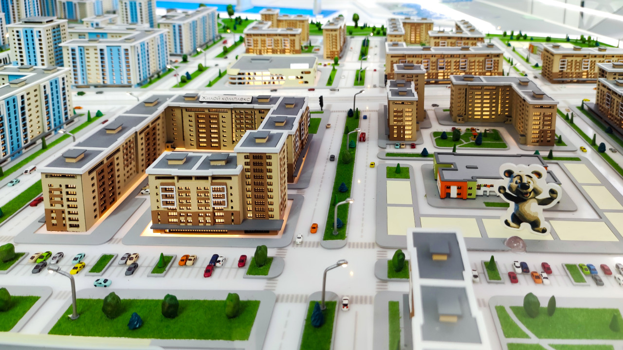 На фото отображён детальный макет городского жилого массива с организованной дорожной сеткой, парковочными зонами и густой застройкой средней этажности. В центре находится крупный жилой комплекс с подсветкой окон, что подчёркивает его структуру. Рядом расположены социальные объекты, включающие участок с фигурой медведя, дороги и озеленённые территории. На заднем плане размещены дополнительные кварталы и транспортные магистрали. Материал подходит для иллюстраций в темах проектирования жилых районов и анализа городской структуры.