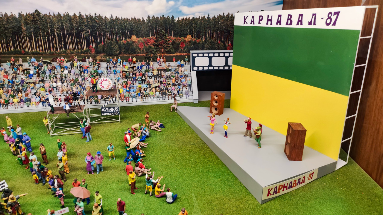На фотографии показан фрагмент диорамы «Карнавал-87», установленной в павильоне «АТОМ» на ВДНХ. В правой части изображена сцена с выступающими, оформленная надписью «Карнавал-87», слева — трибуны со зрителями и элементы кинодекораций. На зелёной площадке расположены миниатюрные фигурки участников в яркой одежде. Праздник 1987 года в Заречном стал одним из первых масштабных городских карнавалов при Белоярской АЭС, положив традицию ежегодных шествий. Фото можно использовать в материалах о культурной истории атомных городов.