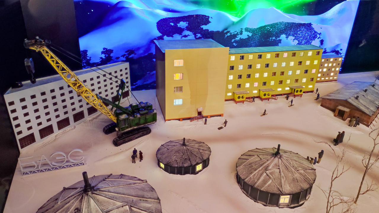 На фотографии запечатлена диорама в павильоне «АТОМ» на ВДНХ, посвящённая Белоярской атомной электростанции, что подтверждает установленная на макете надпись «БАЭС». В сцене изображён северный зимний ландшафт с жилыми зданиями, утеплёнными круглыми постройками, фигурами людей и крупным гусеничным строительным краном. Белоярская АЭС, введённая в эксплуатацию в 1964 году, известна тем, что на её площадке работают реакторы на быстрых нейтронах БН-600 и БН-800 — ключевые объекты российской ядерной энергетики. Экспозиция демонстрирует развитие инфраструктуры вокруг станции и подходит для материалов о музейных макетах, атомной отрасли и инженерных проектах.