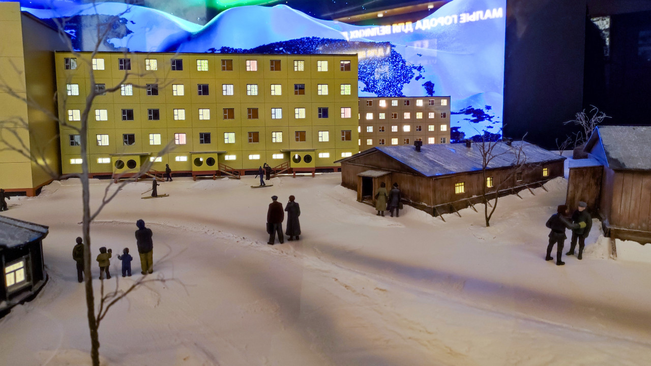 На фото показана часть диорамы в павильоне «АТОМ» на ВДНХ, созданной в рамках выставки-форума «Россия» 2023–2024 годов и посвящённой инфраструктуре Белоярской атомной электростанции. В кадре отображены несколько жилых зданий, фигуры людей, заснеженные дорожки и деревянные хозяйственные постройки. На заднем плане — панорамная подсветка, имитирующая северное сияние и горный рельеф. Белоярская АЭС, введённая в эксплуатацию в 1964 году, известна своими реакторами на быстрых нейтронах, которые стали значимым этапом развития отечественной атомной энергетики. Снимок подходит для публикаций о музейных экспозициях, инфраструктурных проектах и истории ядерной отрасли.